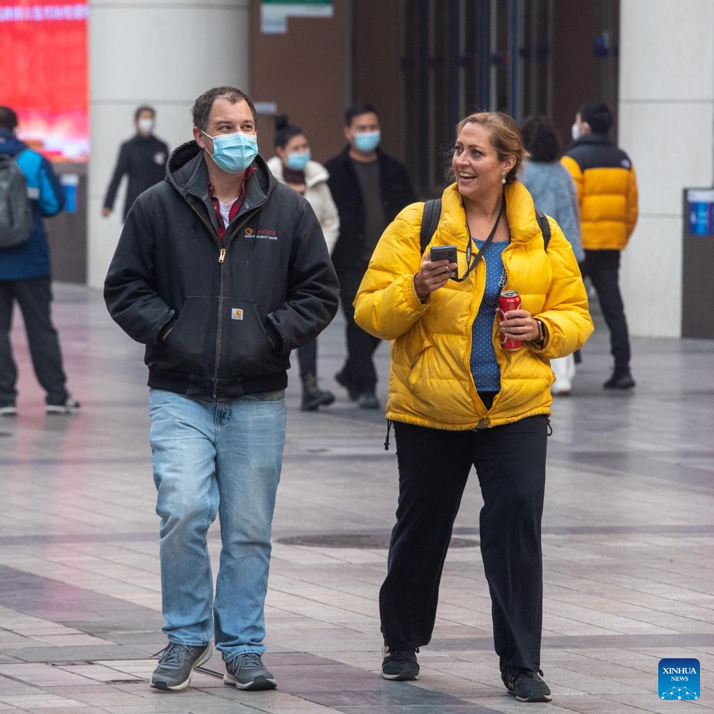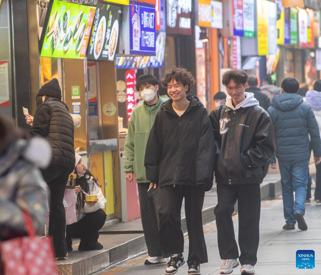 Young people are seen on Bayi street of the Jiefangbei business district in Chongqing, southwest China, on Dec. 23, 2022. (Xinhua/Tang Yi)