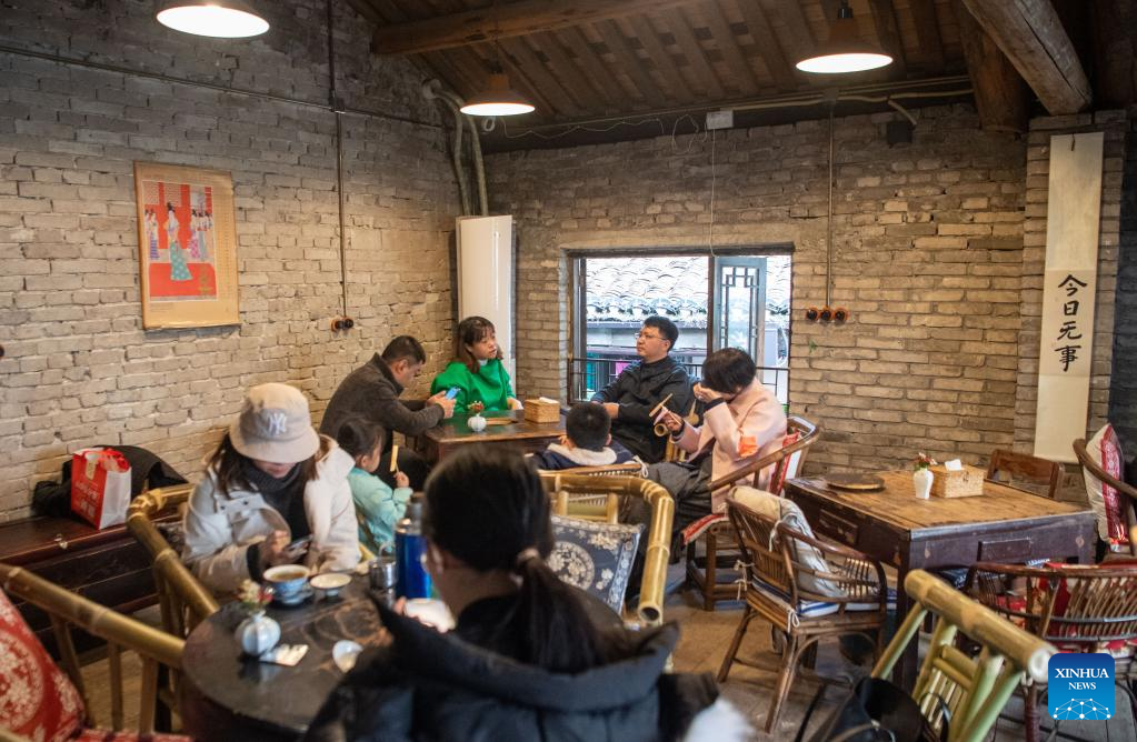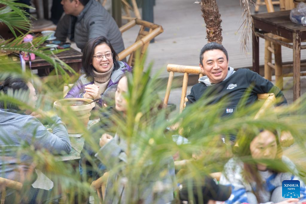 Tourists chat at a teahouse at Shancheng Alley of the Jiefangbei business district in Chongqing, southwest China, on Dec. 24, 2022. (Xinhua/Tang Yi)