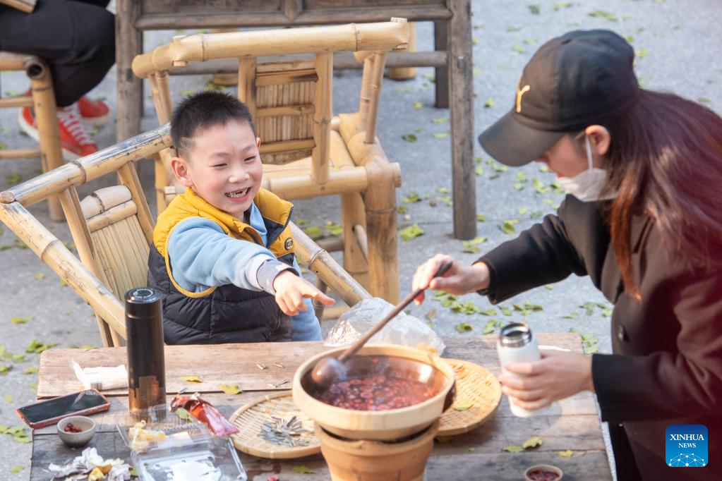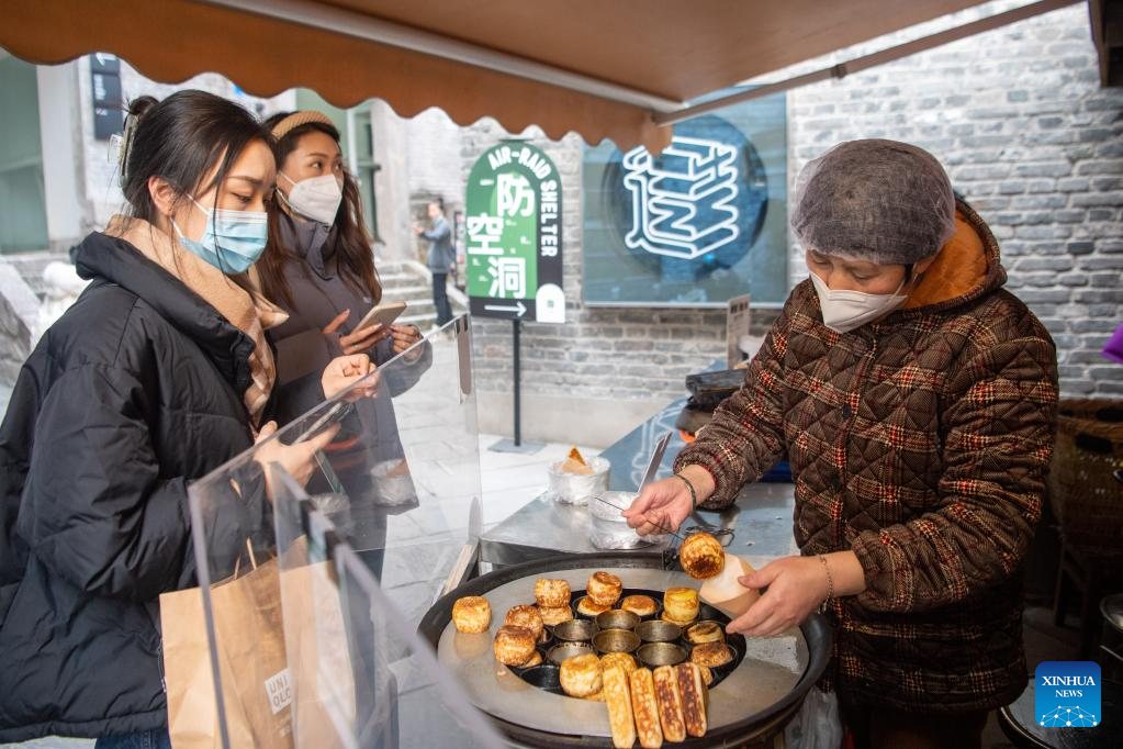 Tourists taste local food at Shancheng Alley of the Jiefangbei business district in Chongqing, southwest China, on Dec. 24, 2022. (Xinhua/Tang Yi)