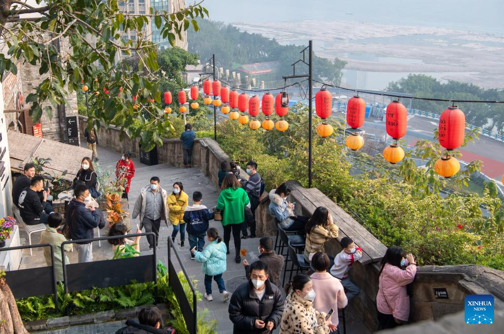 Tourists visit the Jiefangbei business district in Chongqing, southwest China, on Dec. 23, 2022. (Xinhua/Tang Yi)