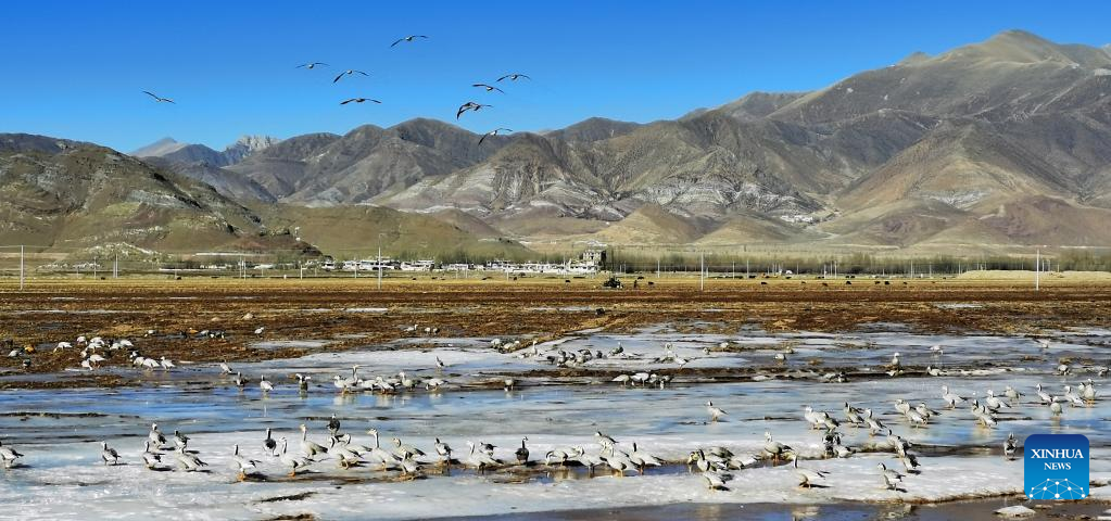 This photo taken by mobile phone on Dec. 24, 2022 shows migratory birds in Lhunzhub County of Lhasa, capital of southwest China's Tibet Autonomous Region. (Xinhua/Shen Hongbing)
