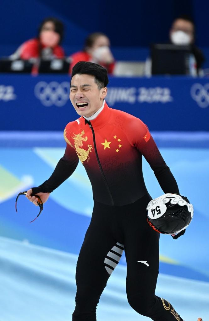 Ren Ziwei of China celebrates after the men's 1000m final of short track speed skating at Capital Indoor Stadium in Beijing, capital of China, Feb. 7, 2022. (Xinhua/Ju Huanzong)