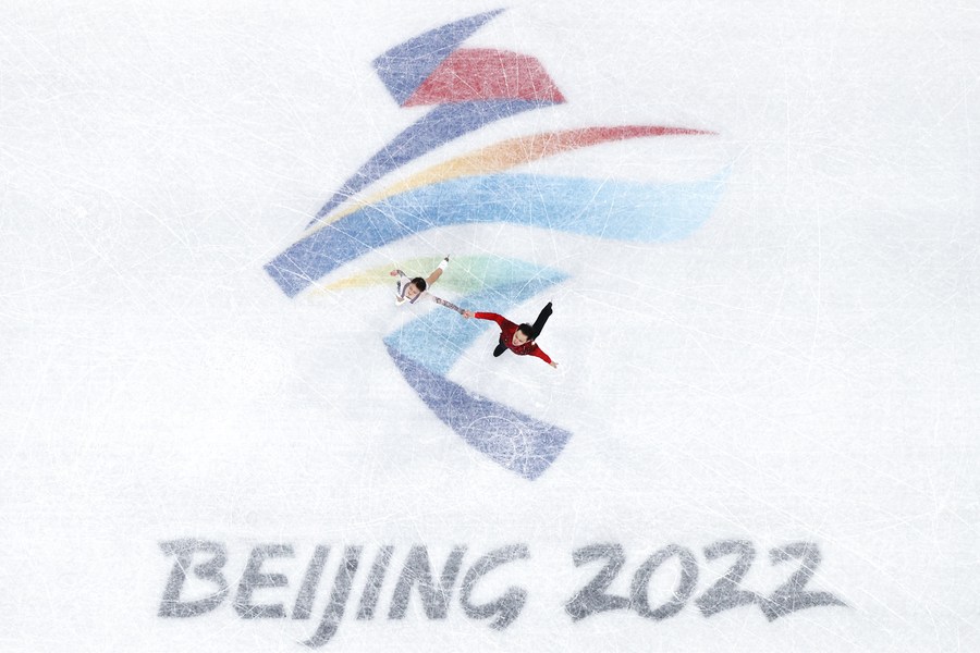 Peng Cheng (L) and Jin Yang of China perform during the figure skating team event pairs free skating at Capital Indoor Stadium in Beijing, capital of China, Feb. 7, 2022. (Xinhua/Ju Huanzong)