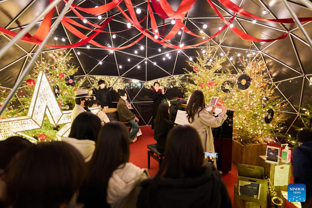 People enjoy a music show to celebrate Christmas and upcoming new year at the Ebisu Garden Place in Ebisu, Tokyo, Japan, Dec. 25, 2022. (Xinhua/Zhang Xiaoyu)