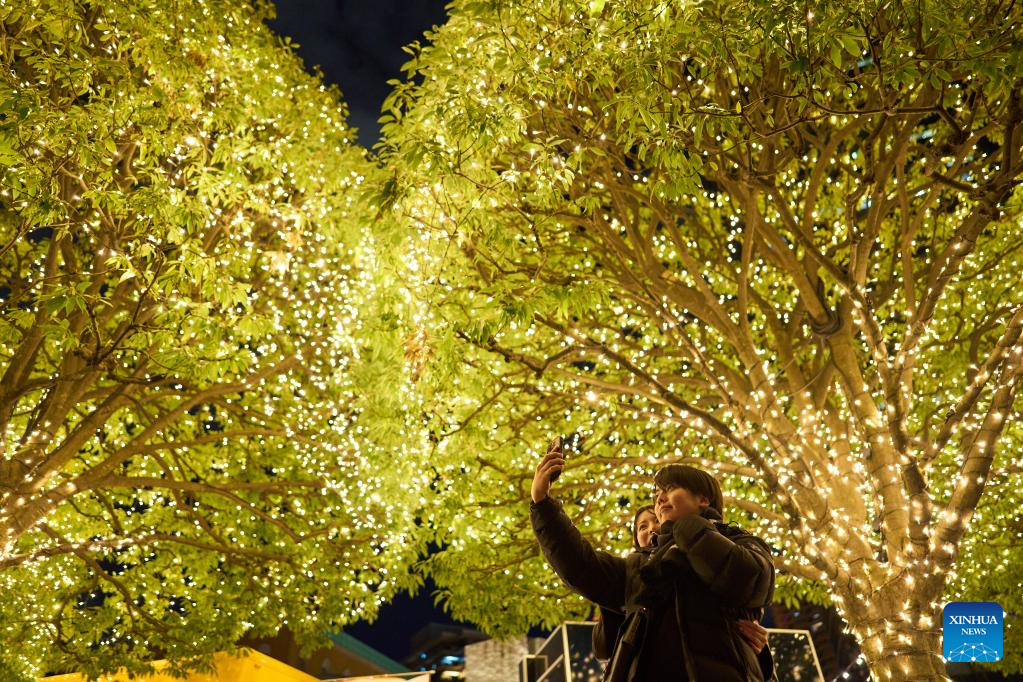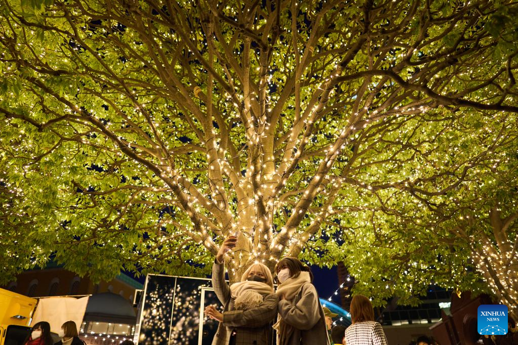 People take selfies under trees with Christmas lights at the Ebisu Garden Place in Ebisu, Tokyo, Japan, Dec. 25, 2022. (Xinhua/Zhang Xiaoyu)