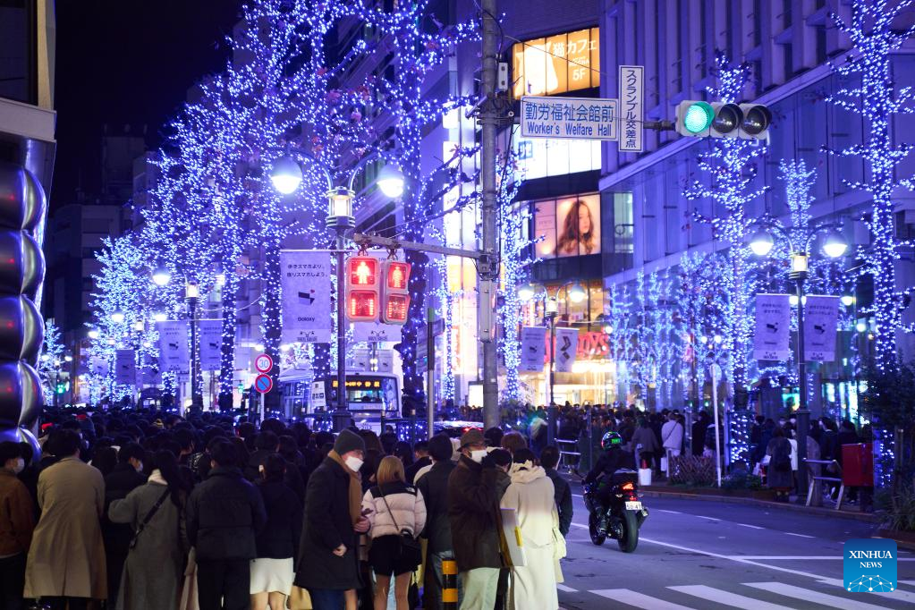 People walk along a street with Christmas lights in Shibuya, Tokyo, Japan, Dec. 25, 2022. (Xinhua/Zhang Xiaoyu)