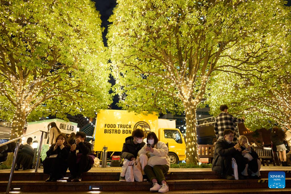 People rest under trees with Christmas lights at the Ebisu Garden Place in Ebisu, Tokyo, Japan, Dec. 25, 2022. (Xinhua/Zhang Xiaoyu)