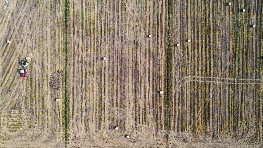 Aerial photo taken on Nov. 3, 2020 shows an agricultural vehicle collecting rice straw in the field at Jiangxiang Town of Nanchang County, Nanchang, east China's Jiangxi Province. (Xinhua/Peng Zhaozhi)