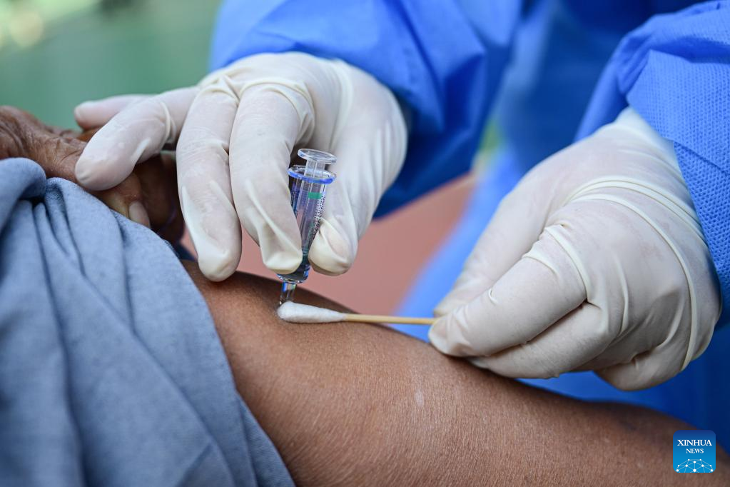 A medical worker administers a dose of COVID-19 vaccine to a senior resident at a community in Wenchang, south China's Hainan Province, Dec. 23, 2022. (Xinhua/Pu Xiaoxu)