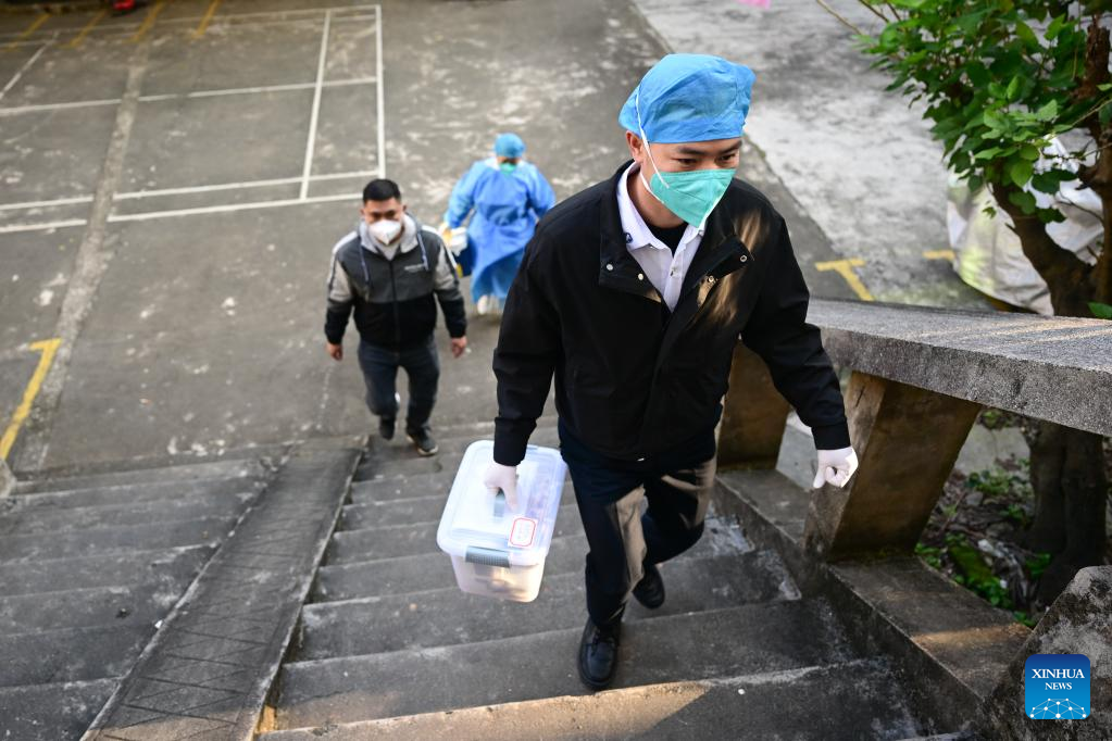 Medical workers walk to provide COVID-19 vaccination for senior residents at a community in Wenchang, south China's Hainan Province, Dec. 23, 2022. (Xinhua/Pu Xiaoxu)