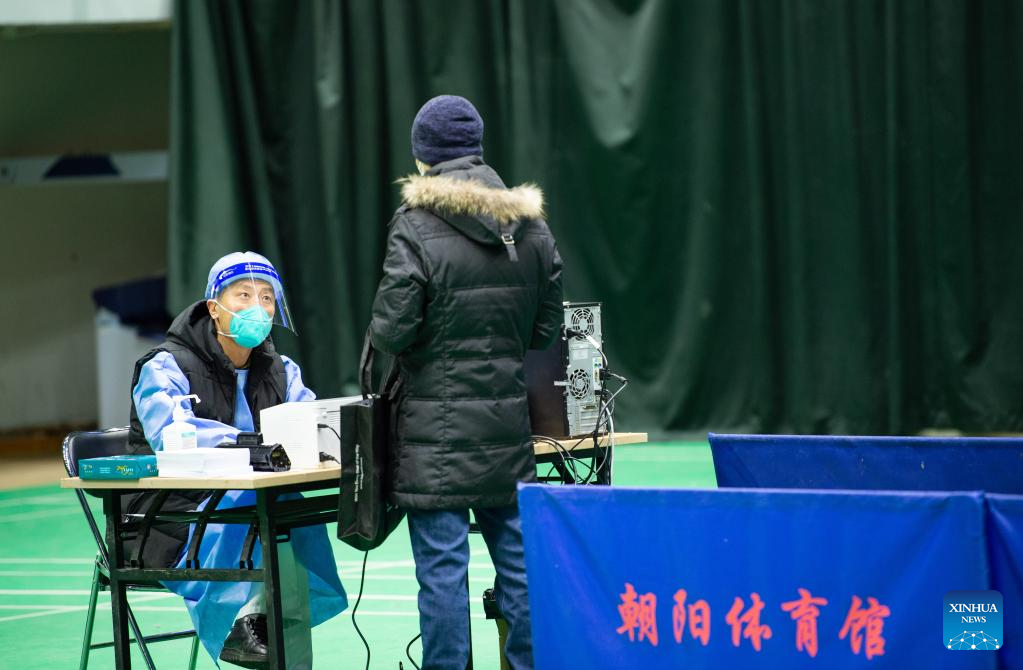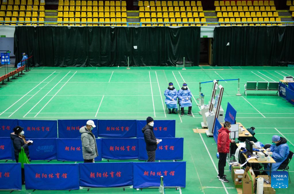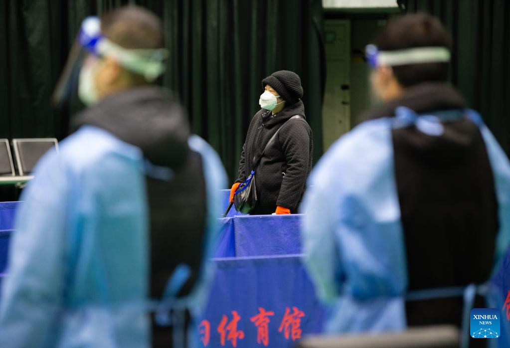 This photo taken on Dec. 24, 2022 shows a citizen (C) waiting in a makeshift fever clinic of Beijing Chaoyang Hospital in Chaoyang Gymnasium in Beijing, capital of China. (Xinhua/Chen Zhonghao)