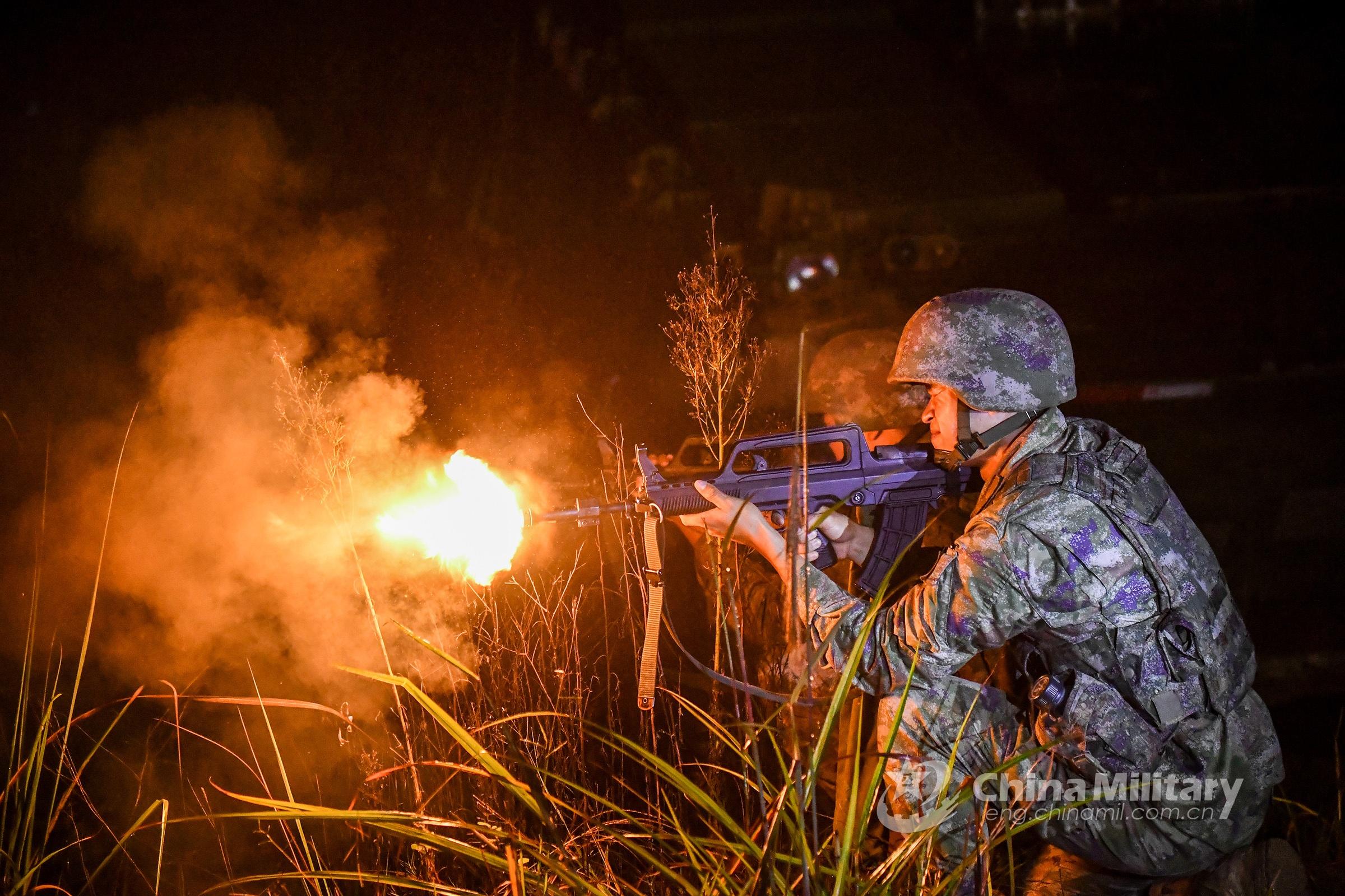 Soldiers assigned to a brigade under the PLA 73rd Group Army fire at mock enemy at night in real-combat training on November 16, 2022. (eng.chinamil.com.cn/Photo by Liu Zhiyong)