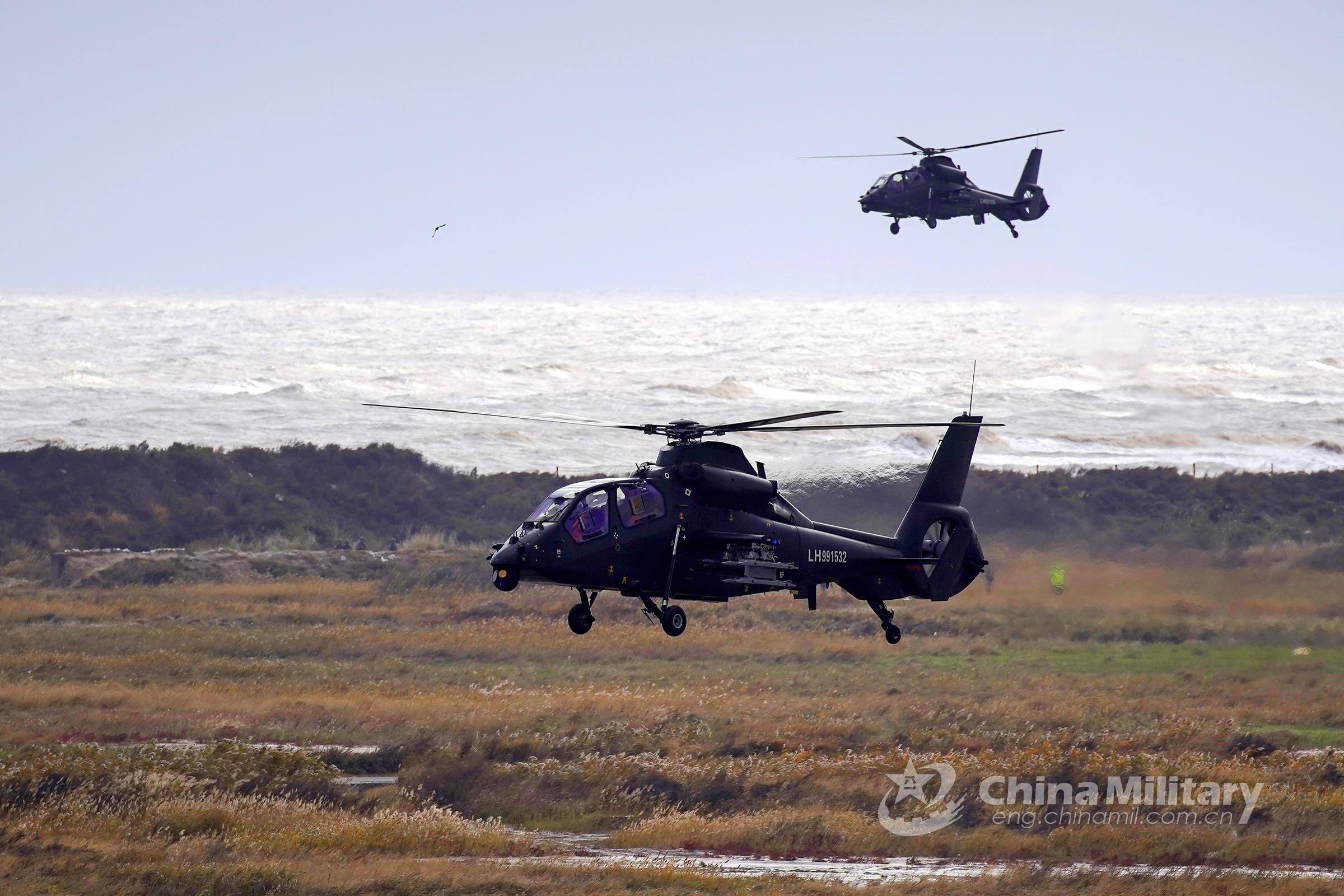 Helicopters attached to an army aviation brigade under the PLA 71st Group Army conduct ultra-low altitude defense penetration operations in flight training on November 13, 2022. (eng.chinamil.com.cn/Photo by Xiang Xu)