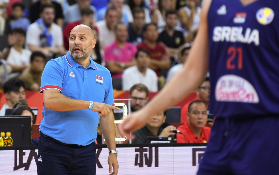 Serbia coach Aleksandar Djordjevic watches his charges play Argentina at the 2019 FIBA World Cup in Dongguan, China on Sept. 10, 2019. (Xinhua/Deng Hua)