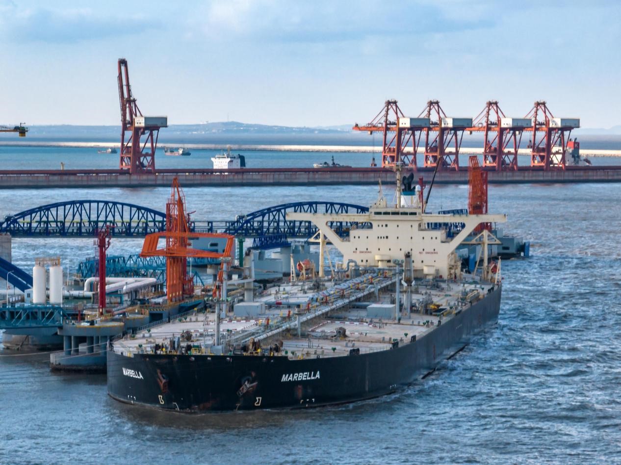 Cargos are unloaded from an oil tanker at a crude oil terminal of the Yantai Port in east China's Shandong province, Dec. 18, 2022. The cargo handling capacity of the Yantai Port for the first time exceeded 400 million tons in 2022, up 13.7 percent year on year. Its container throughput hit over four million twenty-foot equivalent units in 2022, up 13.9 percent from a year ago. (People's Daily Online/Zhang Chao)