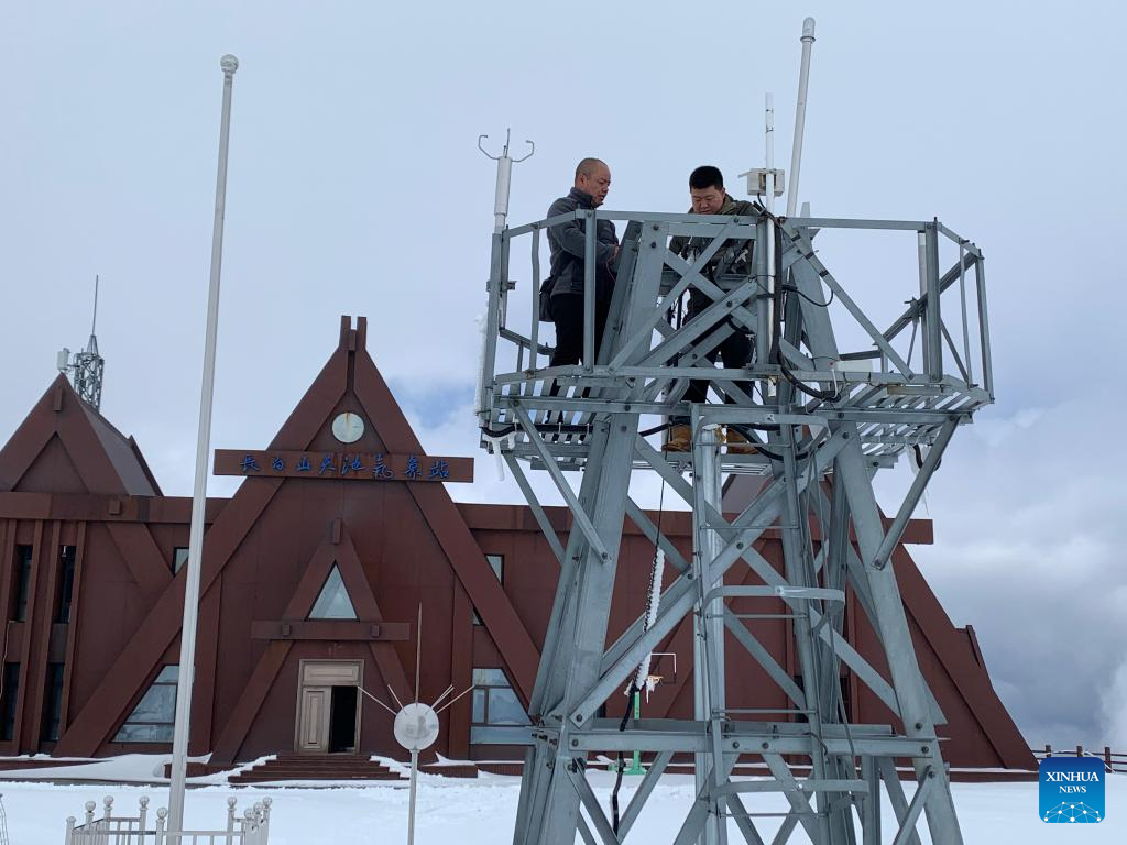 Staff members conduct a check-up on the equipment atop the weather tower at Tianchi meteorological observatory on the main peak of the Changbai Mountain in northeast China's Jilin Province, Sept. 23, 2022. (Xinhua)