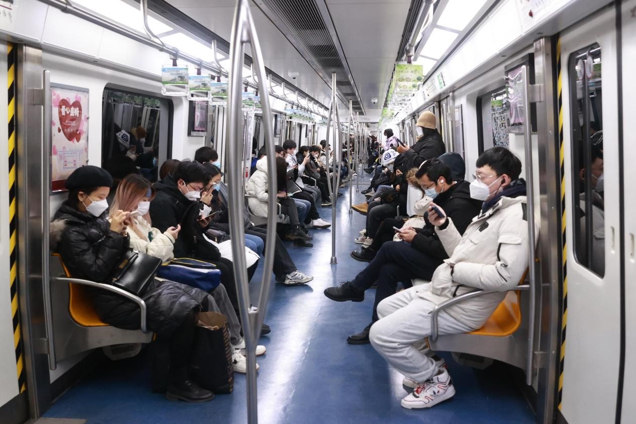 Passengers take subway line 5 in Beijing on Dec. 23, 2022. With the resumption of work and production in Beijing, the passenger volume of Beijing's rail transportation has grown significantly. (People's Daily Online/Chen Xiaogen)