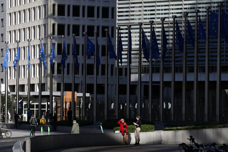 People are seen outside the building of the European Commission in Brussels, Belgium, Oct. 18, 2022. (Xinhua/Zheng Huansong)