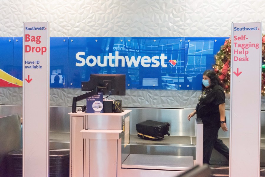 An agent of Southwest Airlines works at Dallas Love Field Airport in Dallas, Texas, the United States, Dec. 17, 2021. (Photo by Guangming Li/Xinhua)