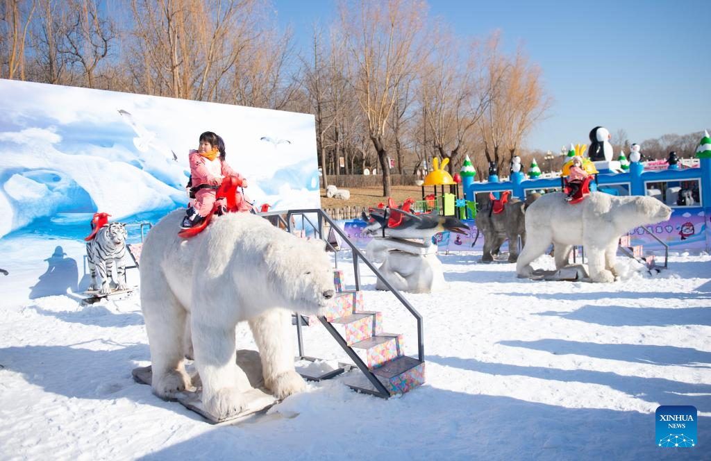 A child rides on a "polar bear" ride at an ice and snow carnival at Taoranting park in Beijing, capital of China, Dec. 28, 2022. (Xinhua/Chen Zhonghao)