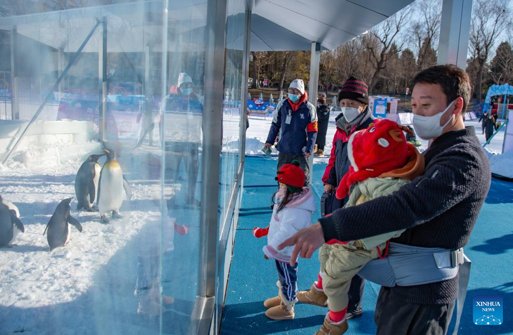 Visitors watch penguins at an ice and snow carnival at Taoranting park in Beijing, capital of China, Dec. 28, 2022. (Xinhua/Chen Zhonghao)