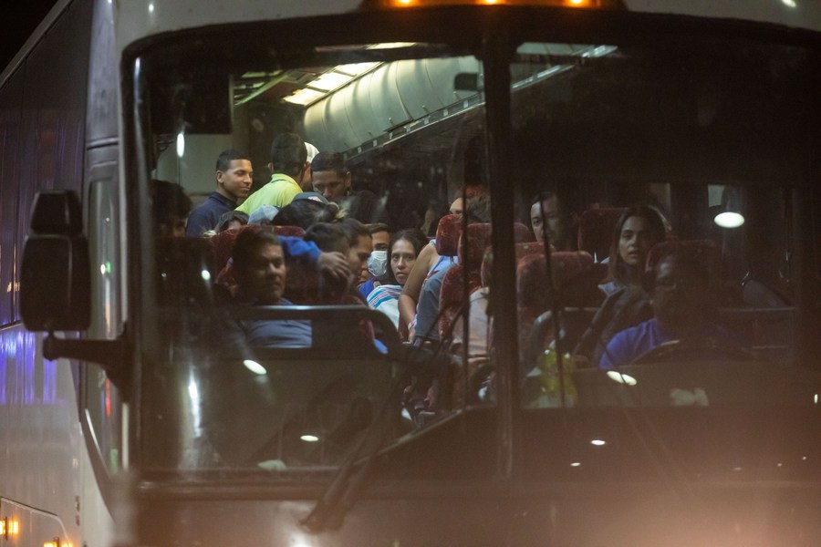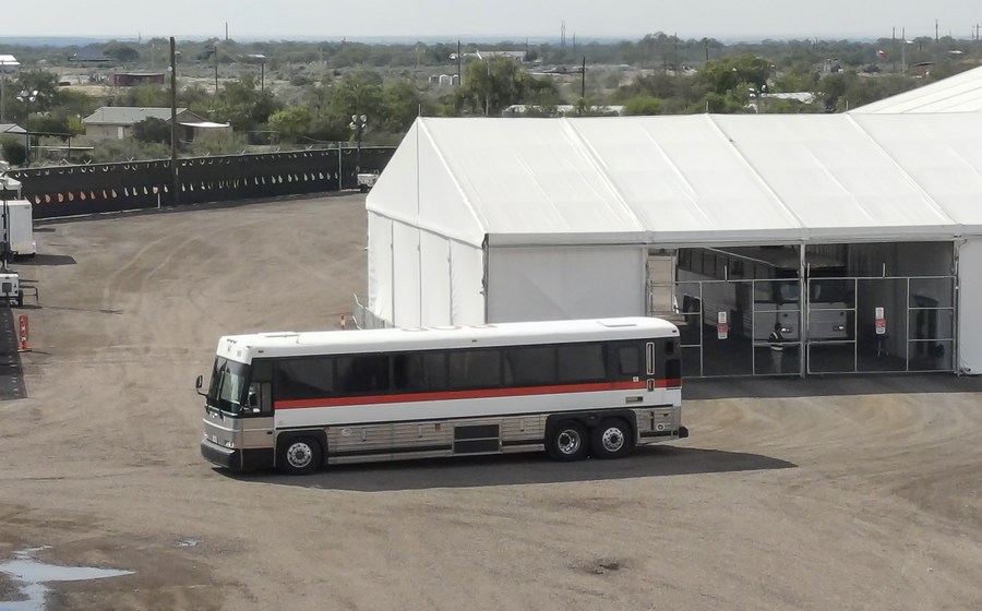 A bus carrying migrants departs from a U.S. Border Patrol processing facility in Eagle Pass, Texas, the United States, on Oct. 9, 2022. (Photo by Nick Wagner/Xinhua)