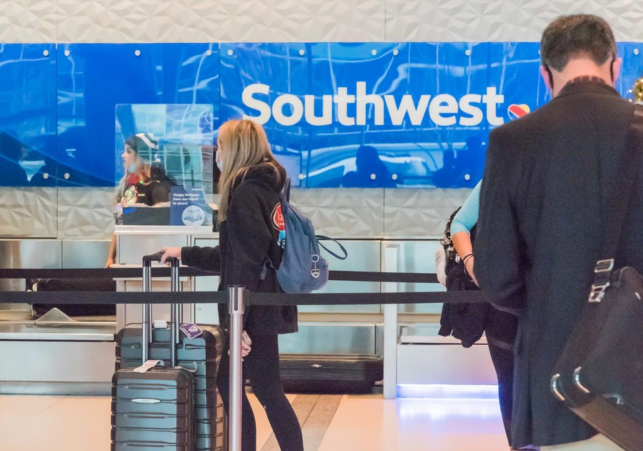 Travelers wait at the check-in counters of Southwest Airlines at Dallas Love Field Airport in Dallas, Texas, the United States, Dec. 17, 2021. (Photo by Guangming Li/Xinhua)