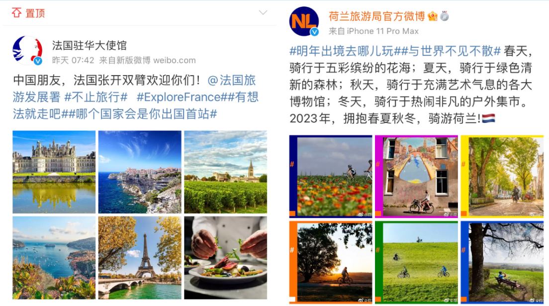 Left: France's embassy in China pins a post on its Weibo account welcoming Chinese visitors. Right: Netherlands Board of Tourism &Conventions in Beijing posts photos on its Weibo account aimed at attracting Chinese visitors. [Photo/chinadaily.com.cn]
