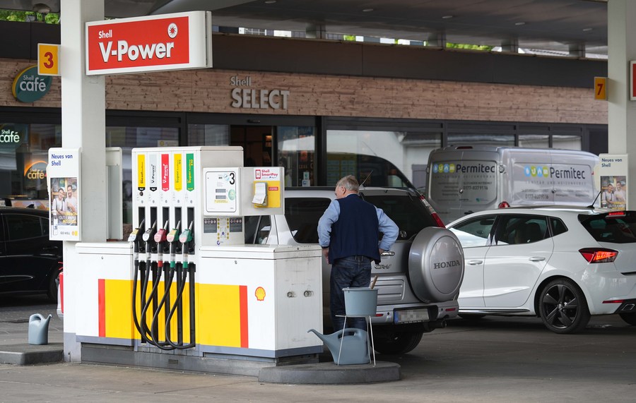 A man fuels a vehicle at a gas station in Berlin, capital of Germany, on May 11, 2022. (Photo by Stefan Zeitz/Xinhua)