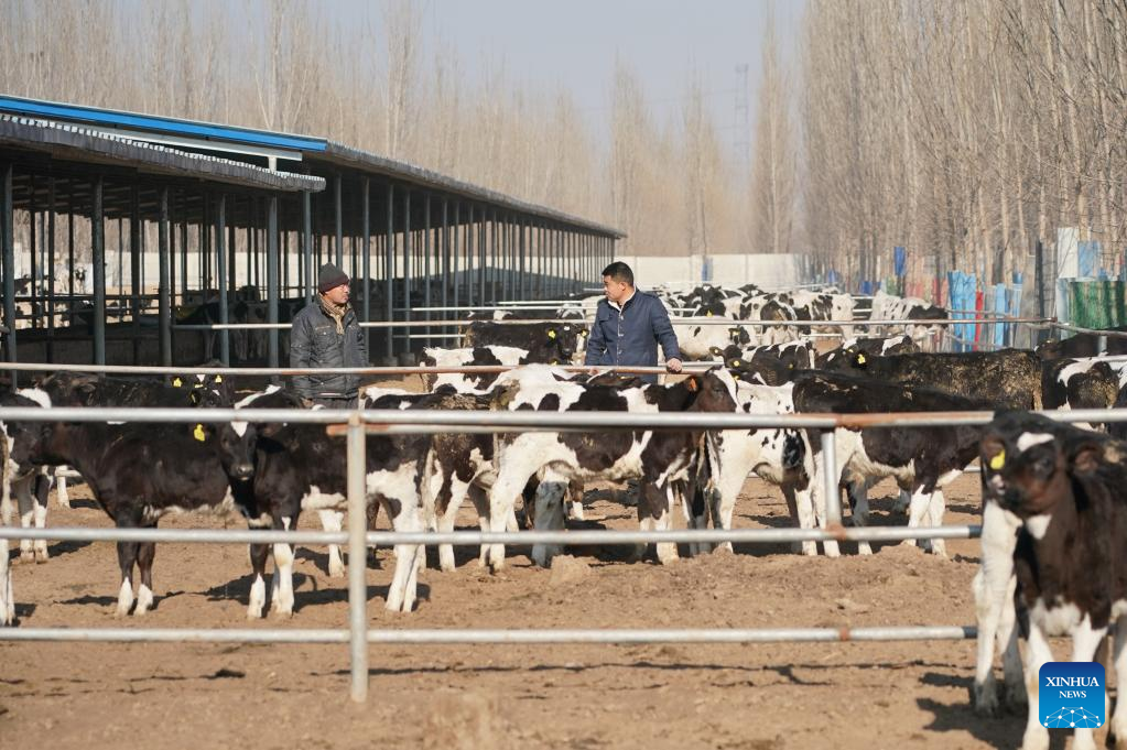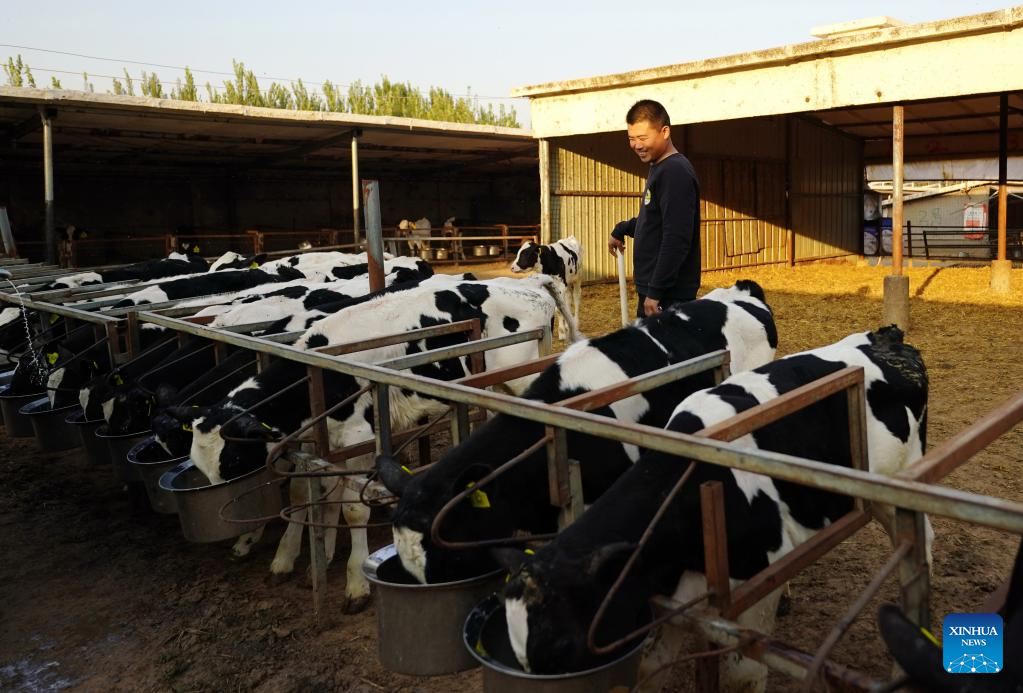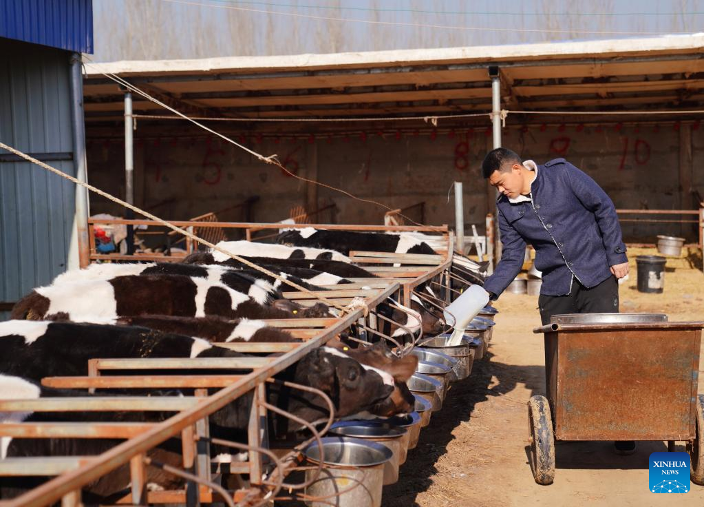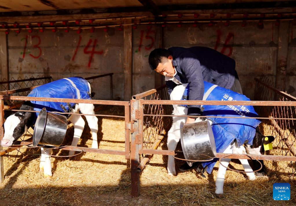 Cheng Pengfei feeds calves at a cowshed in Shaliwang Village of Xinhe County, north China's Hebei Province, Dec. 28, 2022. (Xinhua/Yang Shiyao)
