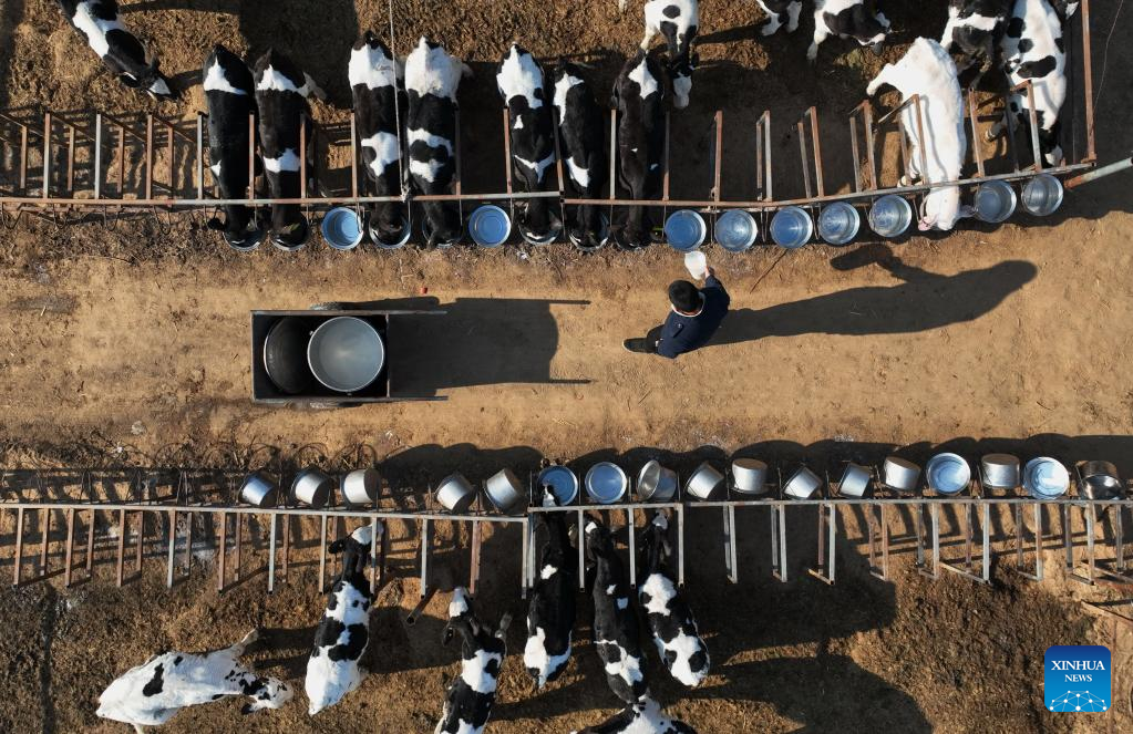 This aerial photo taken on Dec. 28, 2022 shows Cheng Pengfei feeding calves at a cowshed in Shaliwang Village of Xinhe County, north China's Hebei Province. (Xinhua/Yang Shiyao)