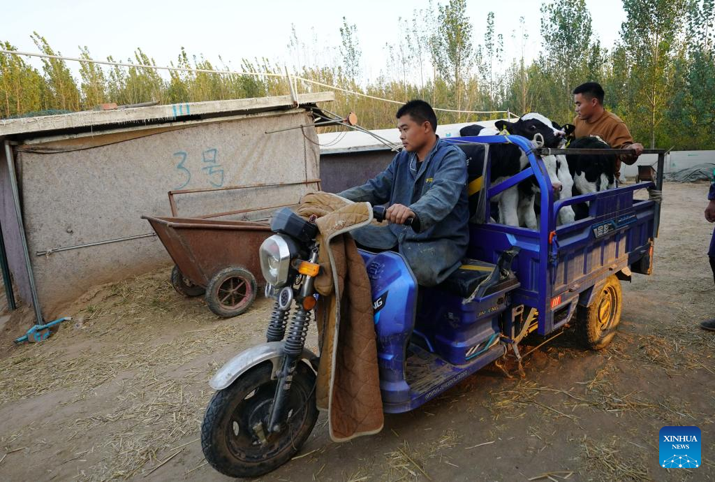 Cheng Pengfei (L) transports newly bought calves with a worker in Shaliwang Village of Xinhe County, north China's Hebei Province, Oct. 19, 2022. (Xinhua/Yang Shiyao)