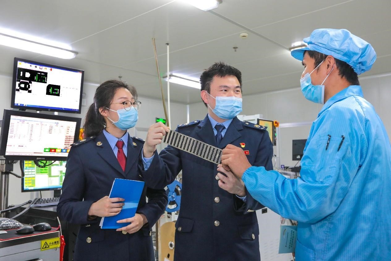 Tax officials visit a high-tech firm in Rugao, east China's Jiangsu province, to learn the implementation of new tax policies, April 11, 2022. (People's Daily Online/Xu Hui)