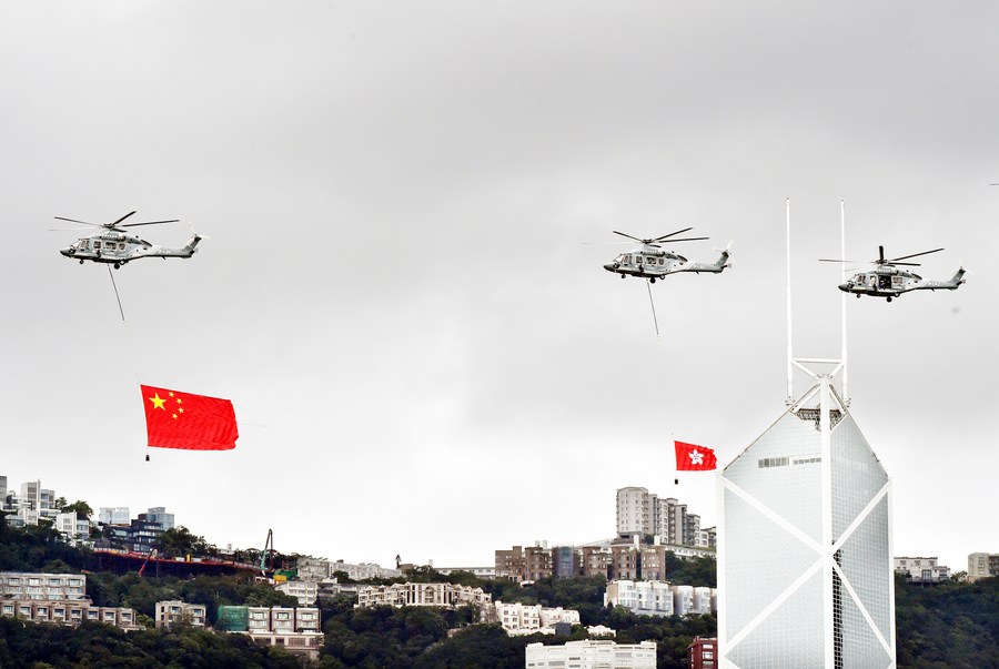 Helicopters carrying China's national flag and the flag of the Hong Kong Special Administrative Region fly over Hong Kong, south China, July 1, 2022. (Xinhua/Lo Ping Fai)