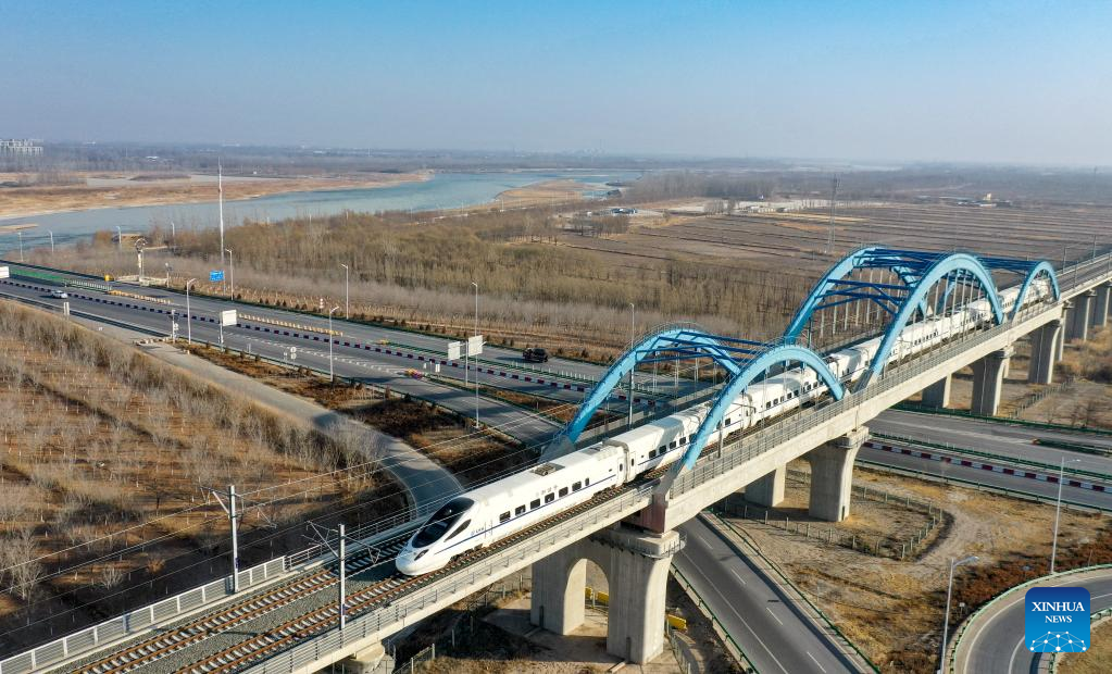 This aerial photo taken on Dec. 29, 2022 shows a train passing by the Yellow River in Zhongwei City, northwest China's Ningxia Hui Autonomous Region. (Xinhua/Feng Kaihua)