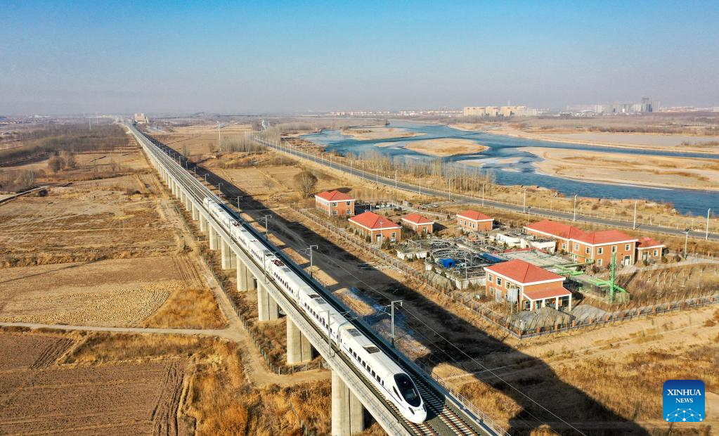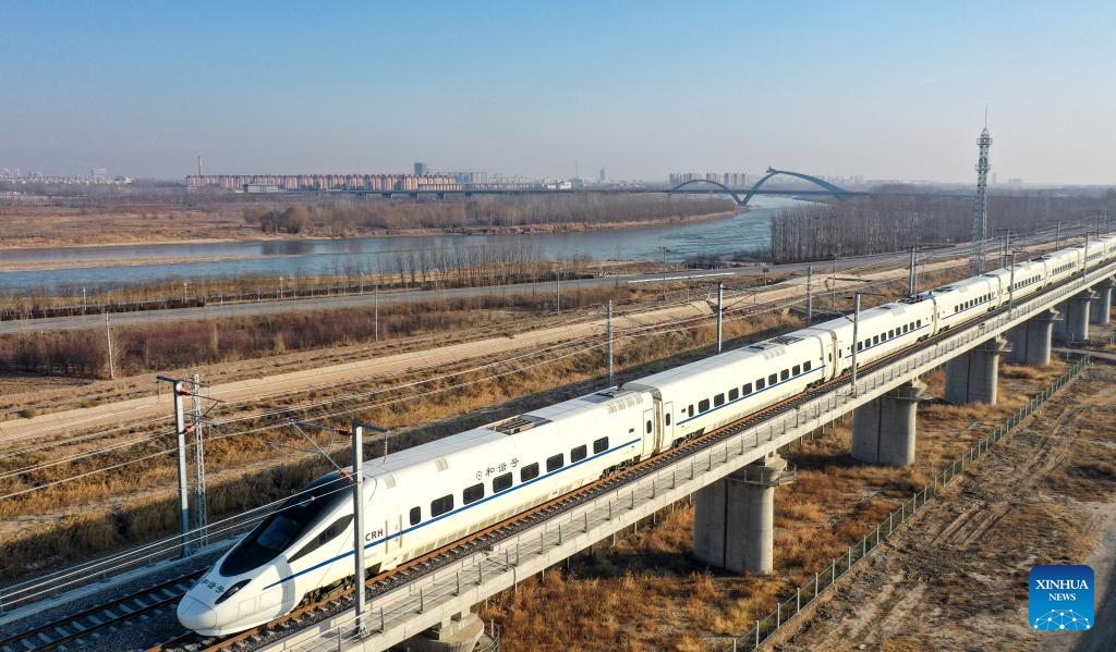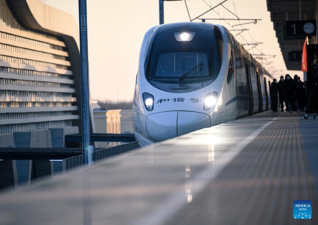 Train No. D2763 waits to depart at Zhongwei South Railway Station in Zhongwei City, northwest China's Ningxia Hui Autonomous Region, Dec. 29, 2022. (Xinhua/Feng Kaihua)