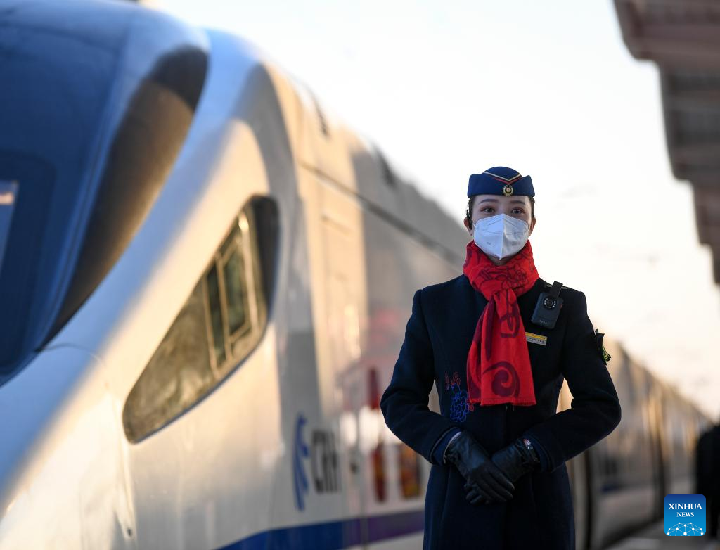 The train conductor Huang Jingjing waits for the departure of train No. D2763 at Zhongwei South Railway Station in Zhongwei City, northwest China's Ningxia Hui Autonomous Region, Dec. 29, 2022. (Xinhua/Feng Kaihua)