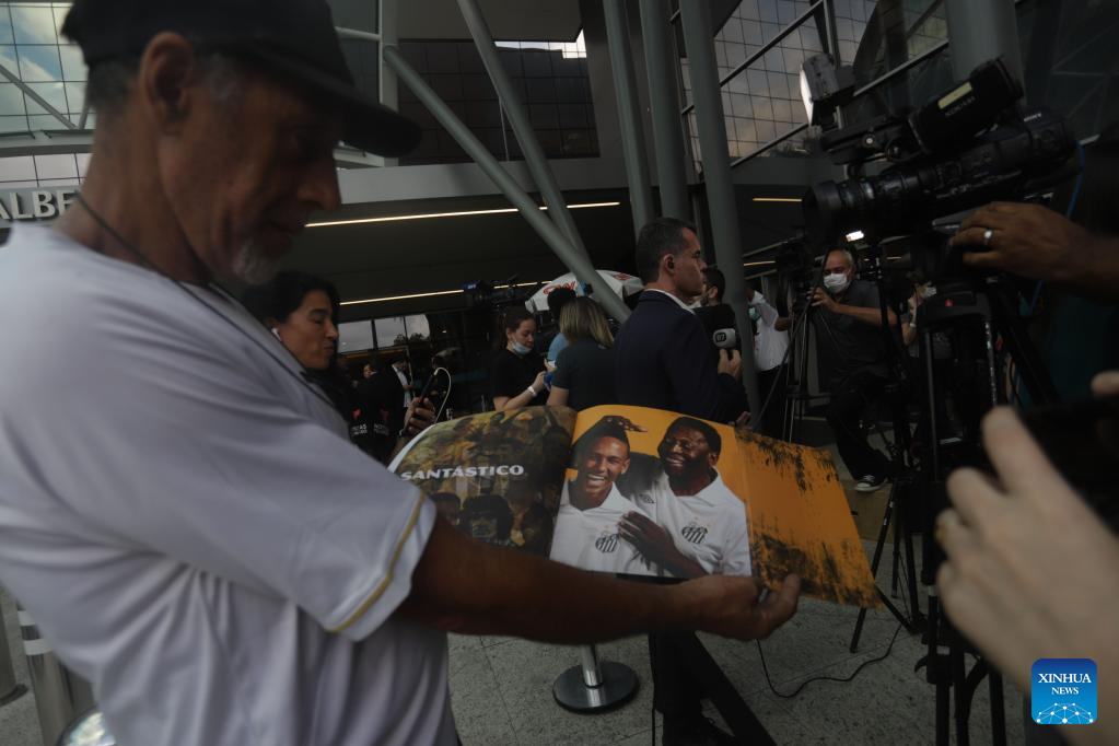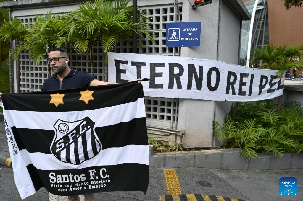 People gather outside the Israelita Albert Einstein Hospital where former Brazilian football star Edson Arantes do Nascimento, Pele, died in Sao Paulo, Brazil, on Dec. 29, 2022. (Xinhua/Rahel Patrasso)
