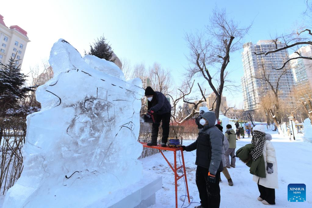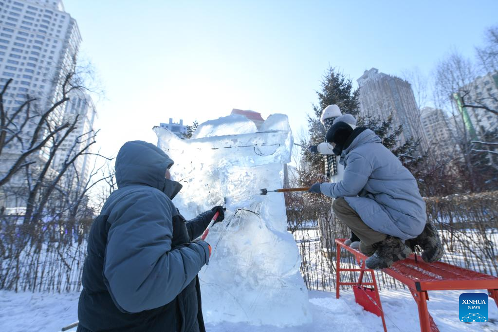Contestants work on ice sculptures during a competition in Zhaolin Park in Harbin, northeast China's Heilongjiang Province, Dec. 29, 2022. (Xinhua/Wang Song)