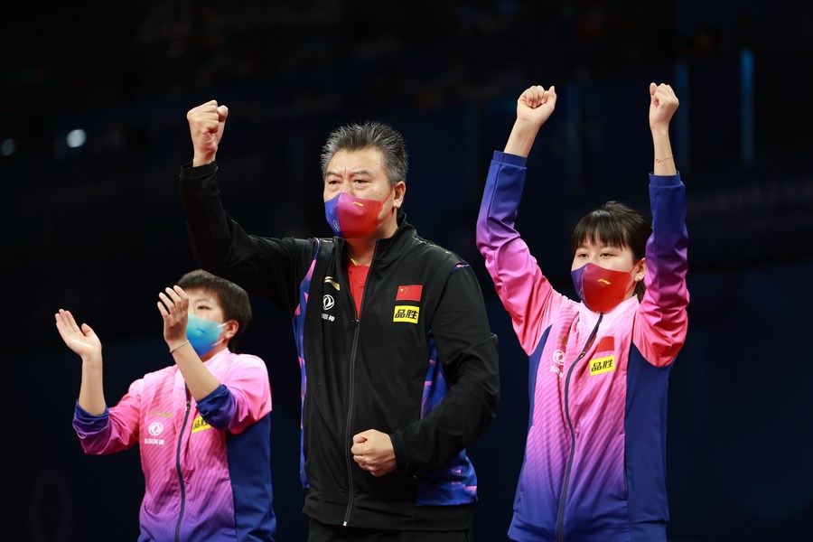 Coach Li Sun (C), player Wang Yidi (L) and Chen Xingtong of China celebrate during the women's teams final at the 2022 ITTF World Team Table Tennis Championships in Chengdu, southwest China's Sichuan Province on Oct. 8, 2022. (Xinhua/Liu Xu)