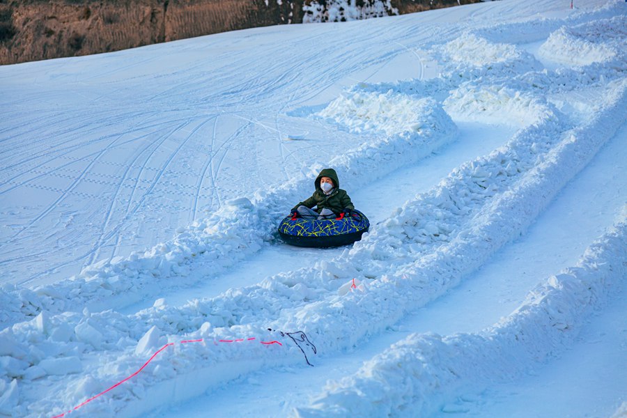 A tourist enjoys ice-snow entertainment activities in Qiyun town, Yuzhong county, Lanzhou, northwest China’s Gansu Province. (Photo courtesy of the publicity department of the CPC Yuzhong County Committee)