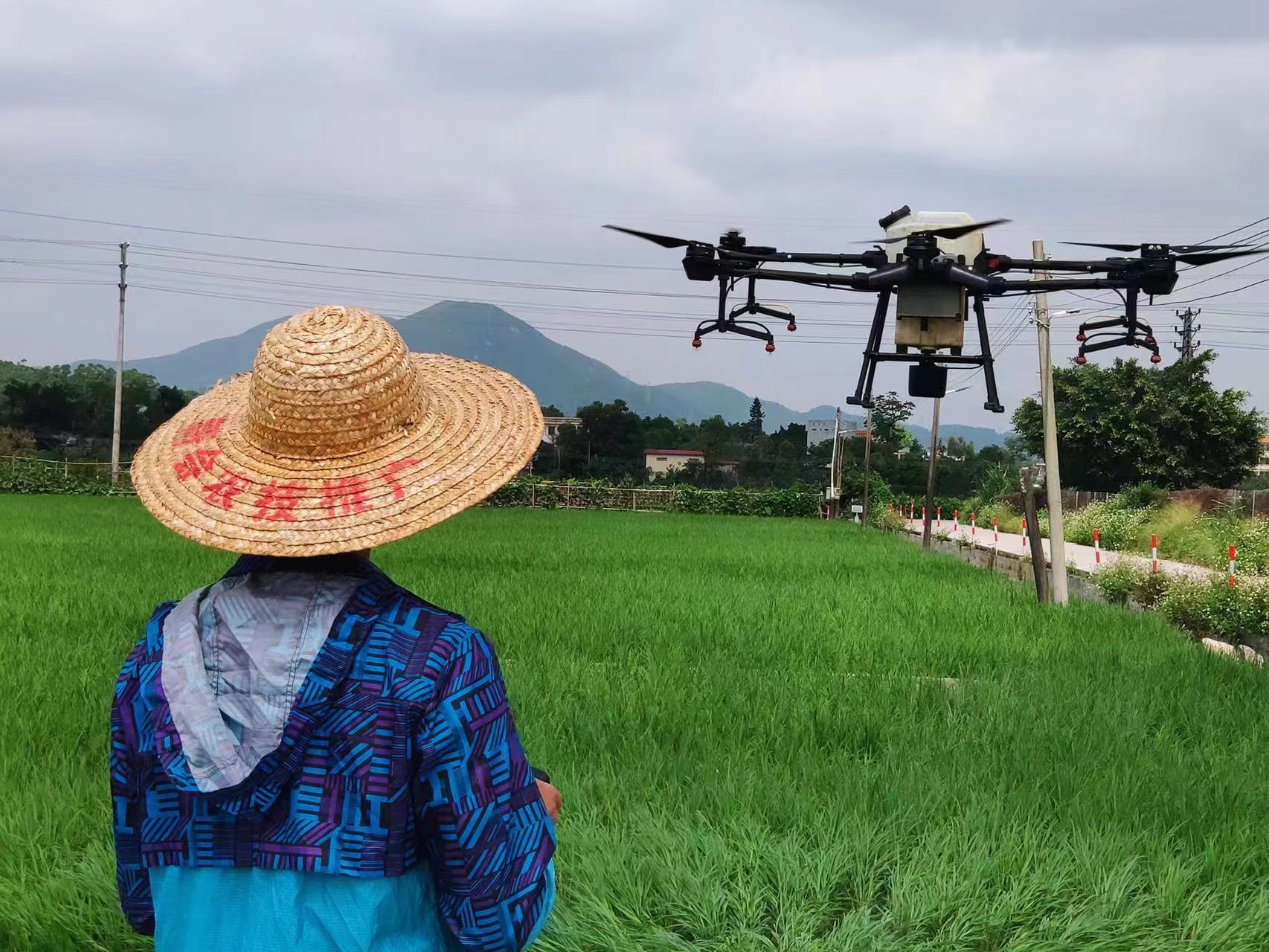 Photos shows a farmer using a drone to carry out crop protection work in the Wenfa plantation, Xinhui district, Jiangmen, south China’s Guangdong Province. (Photo courtesy of the Wenfa plantation)