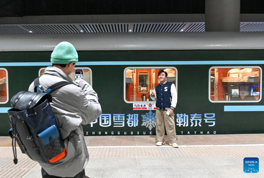 A passenger takes a photo with the train Y965, a passenger train for ice and snow travel, at Urumqi station in Urumqi, northwest China's Xinjiang Uygur Autonomous Region, Dec. 28, 2022. (Xinhua/Hao Jianwei)
