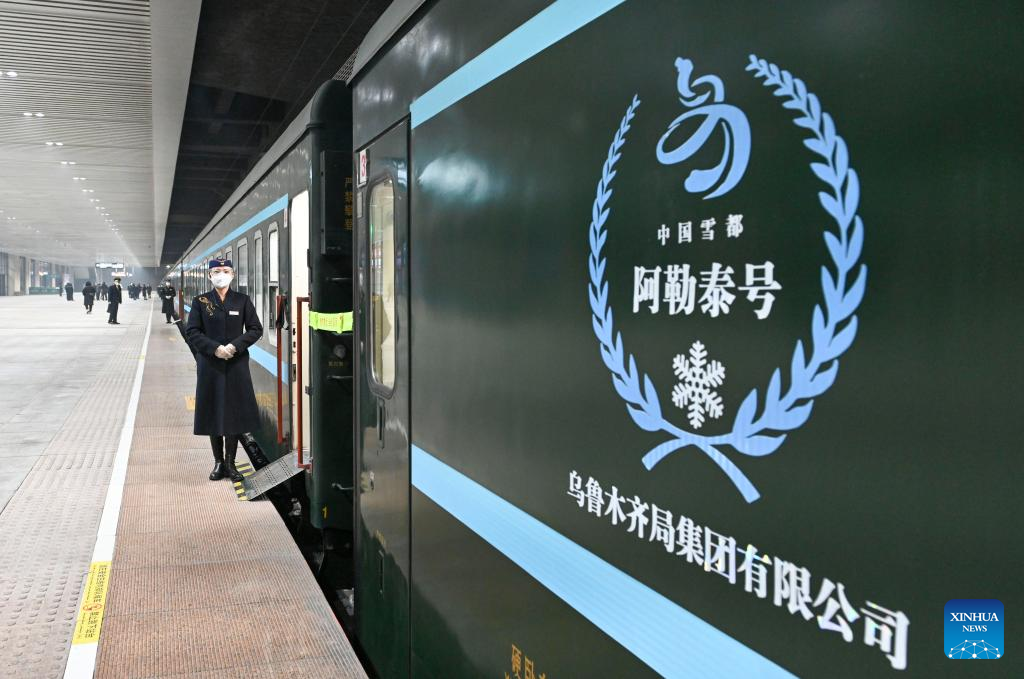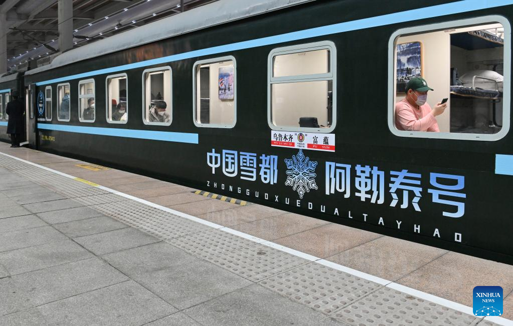 The train Y965, a passenger train for ice and snow travel, is about to depart from Urumqi station in Urumqi, northwest China's Xinjiang Uygur Autonomous Region, Dec. 28, 2022. (Xinhua/Hao Jianwei)