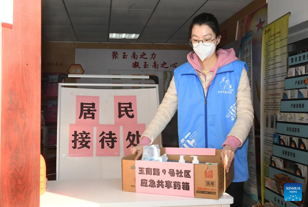 A staff member puts a shared medical kit at the entrance of a residential community in Yangfangdian Subdistrict of Haidian District in Beijing, capital of China, Dec. 27, 2022. (Xinhua/Ren Chao)