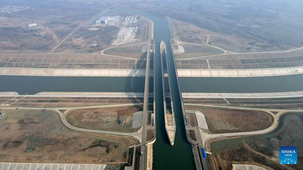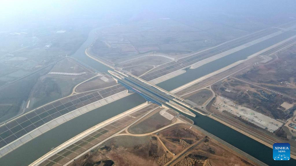 This aerial photo taken on Dec. 30, 2022 shows an aqueduct of the Pihe River over a mega water project to divert water from the Yangtze River to the Huaihe River, in east China's Anhui Province.