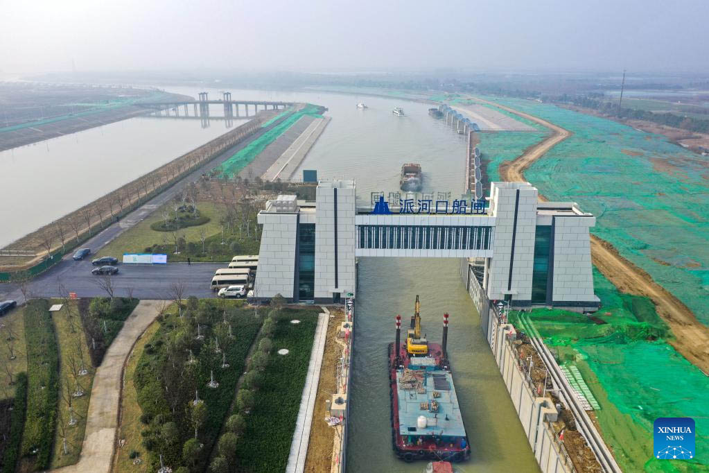 This aerial photo shows vessels passing the Paihekou Lock of a mega water project to divert water from the Yangtze River to the Huaihe River, in east China's Anhui Province, Dec. 30, 2022.