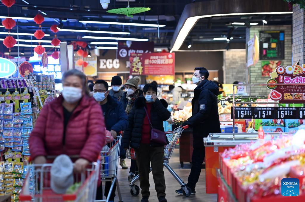 Customers shop at a supermarket in north China's Tianjin, Dec. 31, 2022, the first day of the New Year holiday. (Xinhua/Zhao Zishuo)