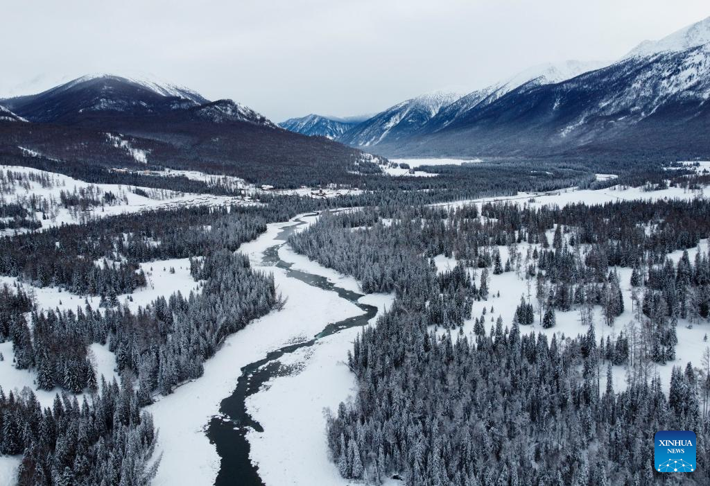 This aerial photo taken on Dec. 29, 2022 shows a winter view of Kanas scenic spot in Altay, northwest China's Xinjiang Uygur Autonomous Region. (Xinhua/Hao Jianwei)