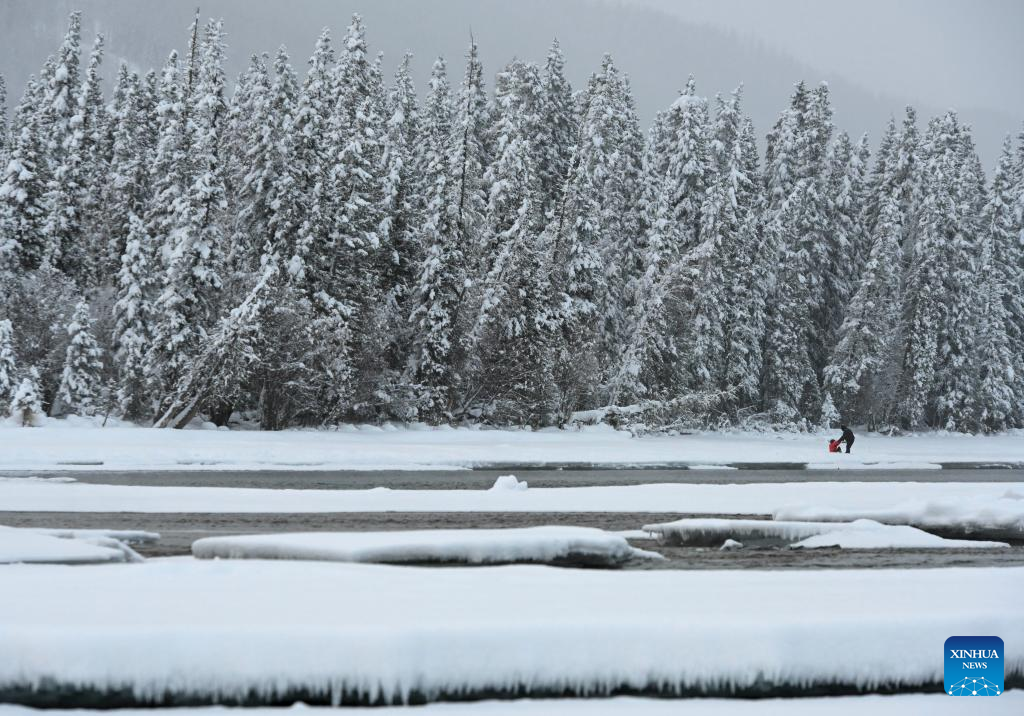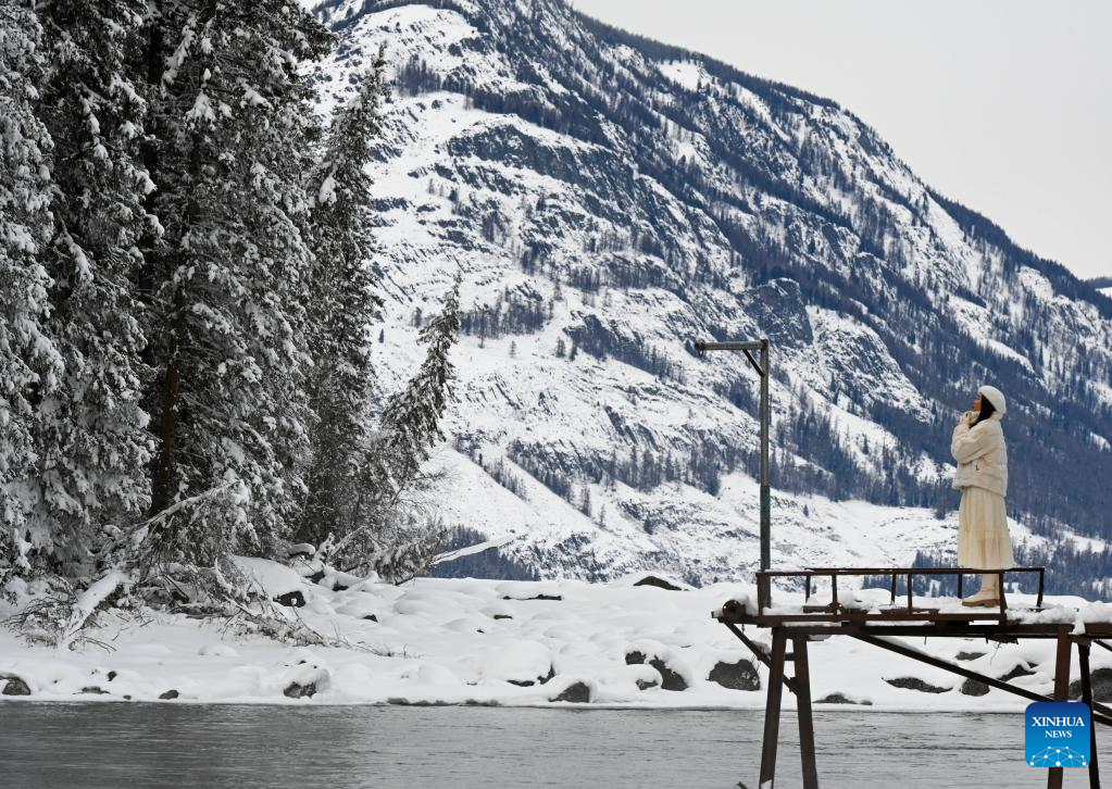 A tourist enjoys winter view of Kanas scenic spot in Altay, northwest China's Xinjiang Uygur Autonomous Region, Dec. 29, 2022. (Xinhua/Hao Jianwei)